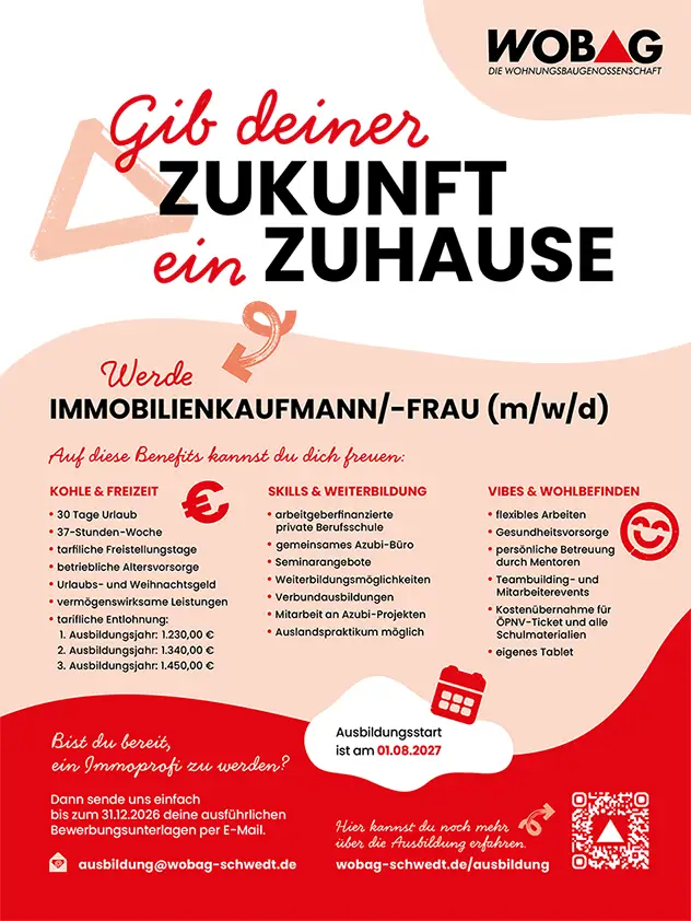 Die Ausbildung zur Immobilienkauffrau (m/w/d) dauert 3 Jahre. Der private Berufsschulunterricht wird in Berlin bei der BBA Immobilienakademie vermittelt und die praktische Ausbildung erfolgt bei uns im Firmensitz in Schwedt/Oder.